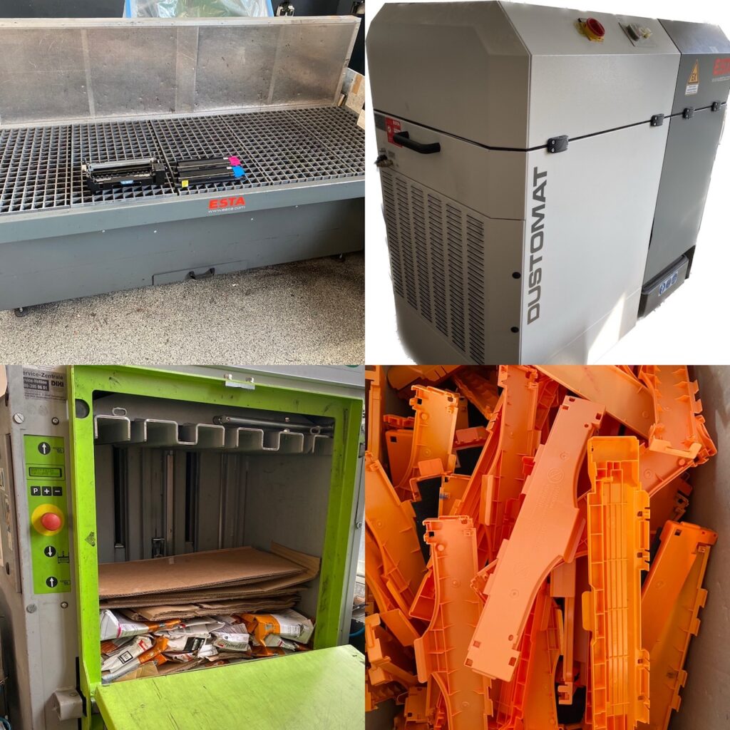 Anschließend wird der Wareneingang in unserer Sortierung ausgepackt. Hierbei trennen wir die Tintenpatronen von den Tonerkartuschen. Dann werden die Tonerkartuschen mittels Absauganlage und zusätzlicher Druckluft gereinigt. Die Pappe wird zu Ballen gepresst und die Folie/Plastik sortenrein sortiert.